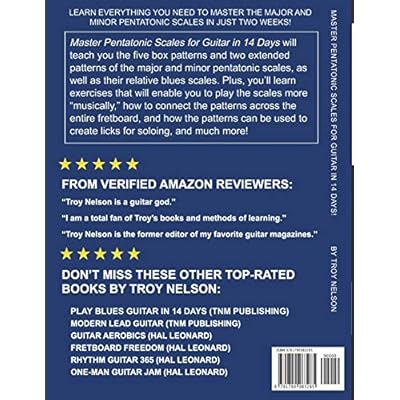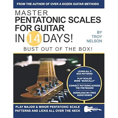 Learning to play the guitar? Then you need this book! Pentatonic scales are the basis for almost anything you'll ever want to learn and master on the guitar. Whether you choose this instruction book or another, take the time to learn the pentatonic scales. They will be the foundation for all of the great playing you dream of doing.Master Pentatonic Scales for Guitar in 14 Days will teach you the five (5) box patterns and two (2) extended patterns of the major and minor pentatonic scales, as well as their relative blues scales.Learn exercises that will enable you to play the scales more “musically,” how to connect the patterns across the entire fretboard, and how the patterns can be used to create licks for soloing, and much more!Inside this book you will find guitar lessons packed with guitar tab and explanations for:•Scale Patterns•Exercises•Arpeggios•Techniques•Lead Licks•Major and Minor Blues Scales•Connecting the PatternsAll guitar examples are demonstrated in clear, expertly formatted tab and include an audio demonstration track so you never have to go it alone.From the author of a dozen guitar method books, Troy Nelson once again brings his easy-to-follow guitar teaching style to this helpful guitar lesson book.FREE access to instant audio downloads from Troy’s website included.Free shipping with Amazon Prime. About Troy Nelson: Troy Nelson is the former Editor of top guitar magazines Guitar One (sister publication of Guitar World) and Guitar Edge. After earning a degree in Occupational Music, Nelson launched his music editing career at Hal Leonard Corporation, the world's largest print music publisher. He's a life-long guitar player whose passion is helping others learn to love the guitar as much as he does.
